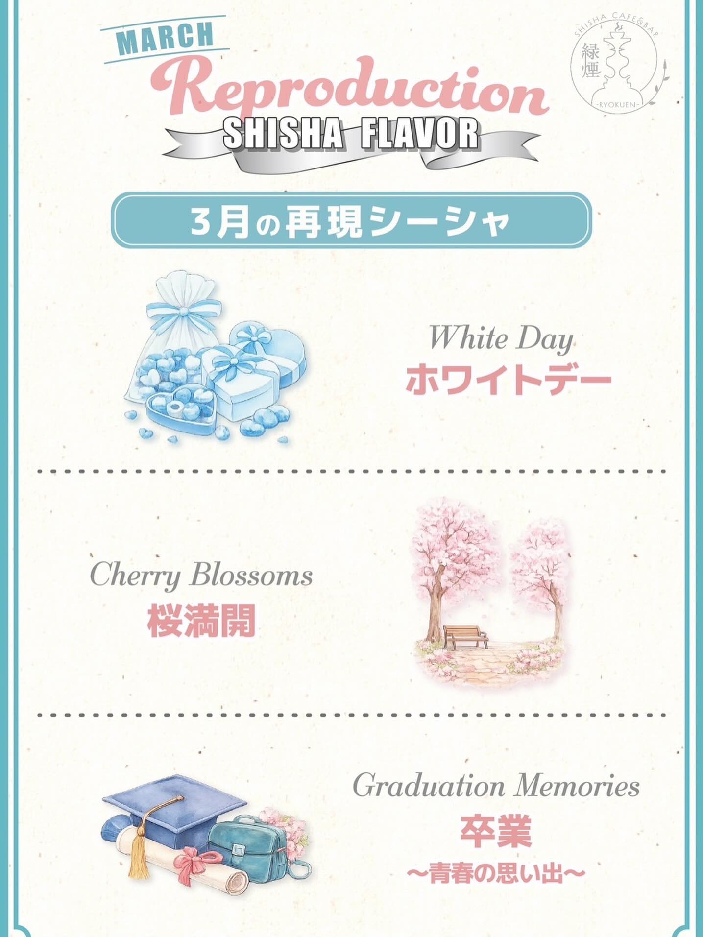 . 2026年3月2日 . 3月期間限定シーシャ🌸🤍 . 春の訪れを感じる、 3月だけの再現フレーバーシーシャ。 今月のテーマは “甘くてやさしい、春のご褒美”。 最初はふんわり甘く、 後味はすっきり。 思わず長居したくなる、 3月限定の特別な一台です。