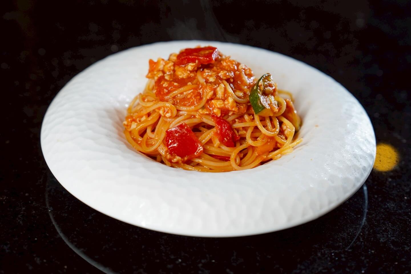 ゴロっと旨みあふれる鶏肉に、色鮮やかな野菜をたっぷり合わせたヘルシーなボロネーゼ。